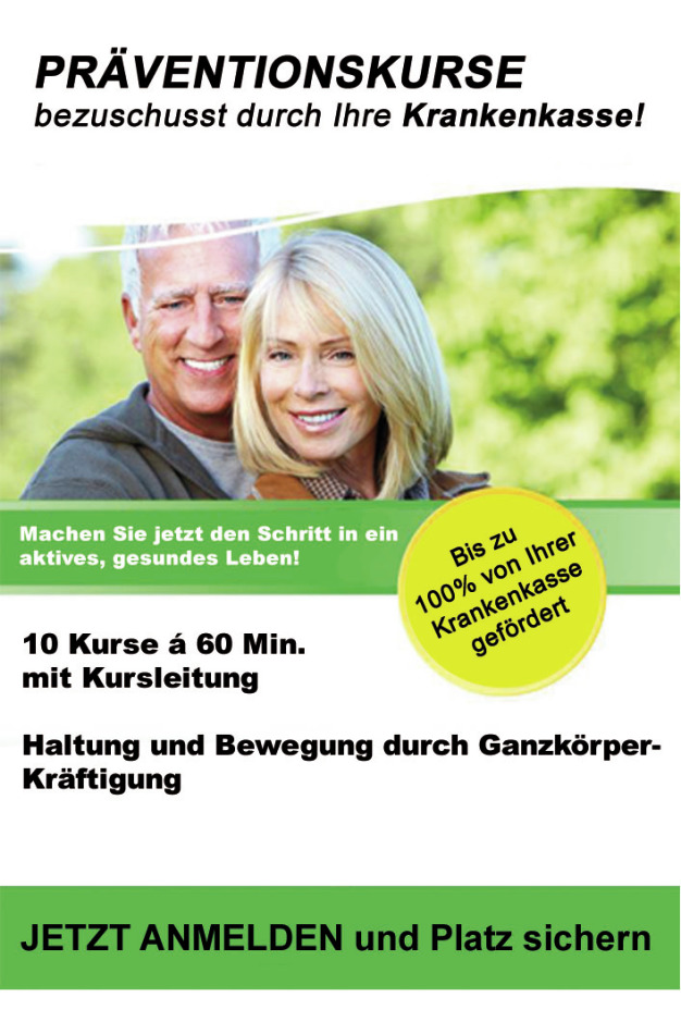 Sie sitzen viel, bewegen sich im Alltag zu wenig und sind öfter gestresst? Mit dem Präventionskurs können Sie etwas für sich, ihre Haltung und ihre Gesundheit tun. Im Kurs erlernen Sie effektive und vielseitigeÜbungen, die zum Gleichgewicht der verschiedenen Muskelgruppen beitragen. Schwächere Muskulatur wird gestärkt, verkürzte Muskelgruppen werden gedehnt. Zum Erhalt der Beweglichkeit und Stärkungeiner aufrechten Haltung liegt der Schwerpunkt auf der Kräftigung des ganzen Körpers. Mit der gezielten Wissensvermittlung bekommen Sie immer Hilfestellungen wie Sie Ihren Alltag aktiver undgesundheitsförderlich gestalten können. Dazu gehört auch die Vermittlung von ausgewählten Dehnübungen, die ihr Wohlbefinden steigern. In der Gruppe erleben Sie, dass die Kombination aus Kräftigungs-,Dehnungs- und Entspannungsübungen Spaß macht und Sie über den Kurs hinaus für Bewegung in Ihrem Alltag motiviert sind.